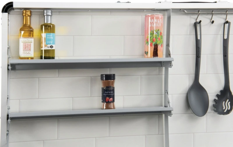 Met de Outwell Magante campingkeuken ben je van alle markten thuis. Deze campingkeuken heeft een werkbladhoogte van 90 cm, opberghaken, handige planken en een weerbestendig werkblad tegen water, hitte en krassen. Of ‘ie nog wat extra’s heeft? Zeker weten! De uitrekbare afwasteil, keukengerei, magnetische messenhouder, keukenrol houder en verstelbare poten maken het koken op de camping een eitje.